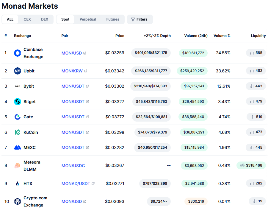 현재(2025년 11월 기준), MON은 일부 거래소에서 거래 준비 중입니다.