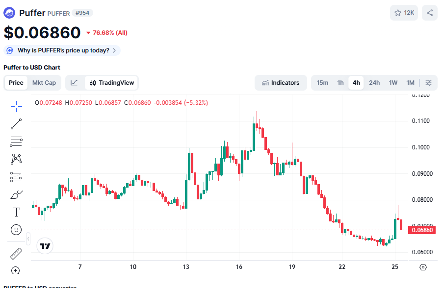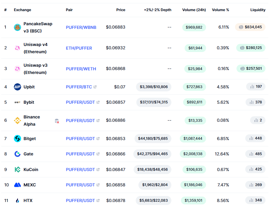 - Gate.io: PUFFER/USDT 페어가 활발히 거래 중이며, 최근 24시간 거래량이 약 2 백만 달러 수준으로 보고됨.