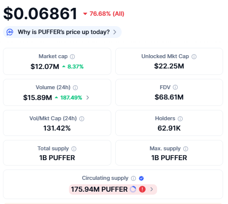 - 여러 정보원에 따르면 PUFFER의 시가총액(Market Cap)은 약 1,200만 ~ 2,200만 달러 수준입니다. 예컨대 CoinGecko 기준으로 약 2,353만 달러.