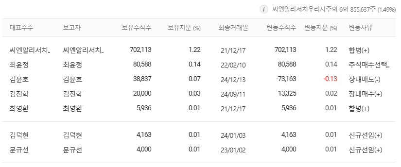 • 최대 주주: 씨엔알리서치의 경영권을 가진 최대 주주는 회사의 안정적인 운영에 중요한 역할을 합니다. (정확한 지분율은 금융감독원 공시를 통해 확인 필요)