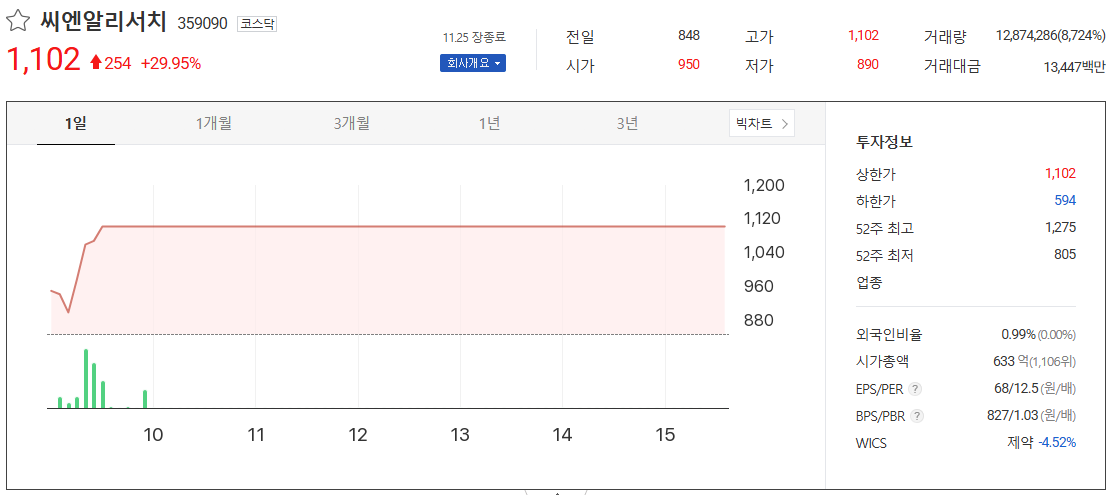 씨엔알리서치 일봉 시세 차트