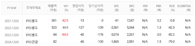 2024년 매출액: 82억 원 / 영업이익: -40억 원 / 당기순이익 -130억 원 / EPS: -1,865억 원