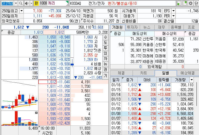 - 바닥권 형성 및 반등 시도: 최근 주가는 1,300원~1,400원대에서 강력한 바닥을 다지는 모습을 보였습니다. 2026년 1월 중순 기준, 단기적으로 1,600원대를 회복하며 급락세가 진정되는 양상입니다.