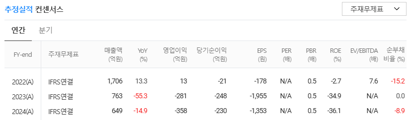 • 매출 및 영업이익: 2024년 말 기준 연결 매출액은 감소 추세였으며, 지속적인 영업손실로 인해 결손금이 누적된 상태입니다.