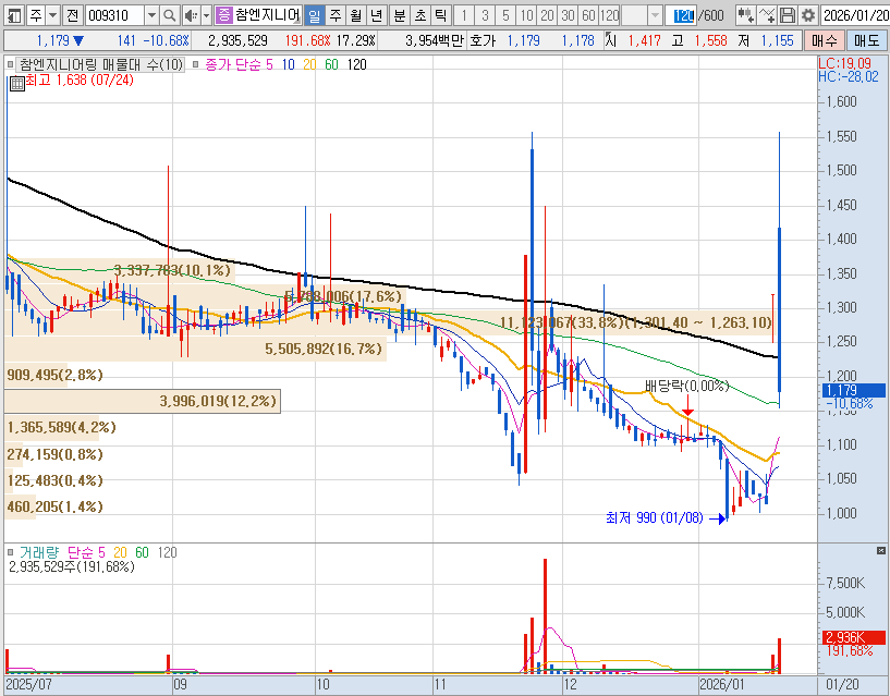 참엔지니어링 일봉 시세 차트 2026.01.20