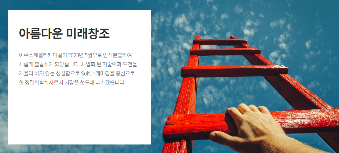 이수스페셜티케미컬은 2023년 5월 이수화학으로부터 인적분할하며 정밀화학 및 전고체 배터리 소재 전문 기업으로 새롭게 출발했습니다. 차별화된 기술력과 도전을 멈추지 않는 성실함을 바탕으로, Sulfur(황) 케미컬 중심의 정밀화학 시장을 선도하며 글로벌 소재 시장의 주역으로 도약하고 있습니다.