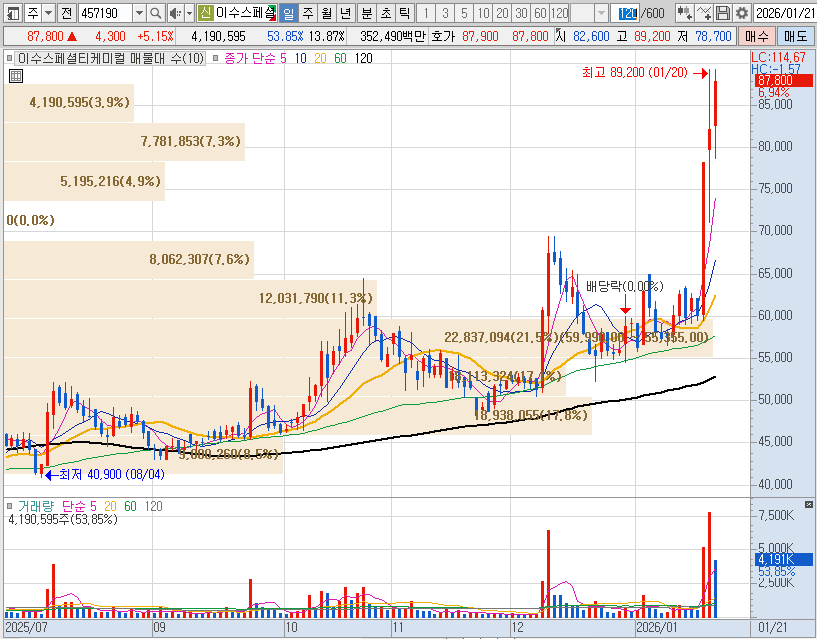 이수스페셜티케미컬 일봉 시세 차트 2026.01.21