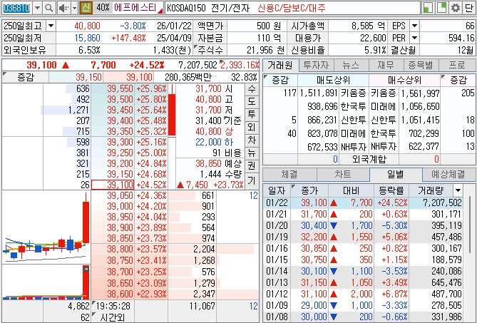 - 현재가: 약 38,600원 선 (전일 대비 약 22.9% 급등 중)