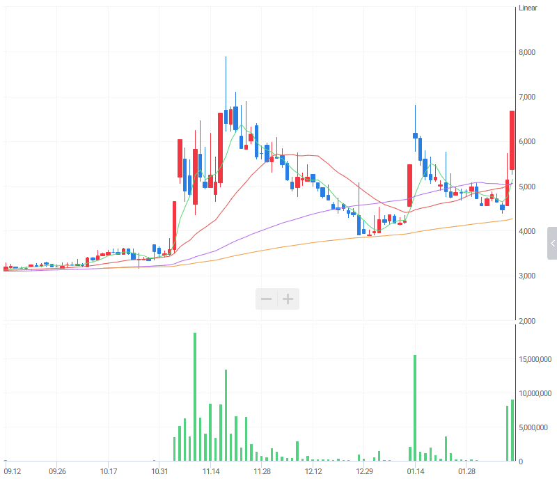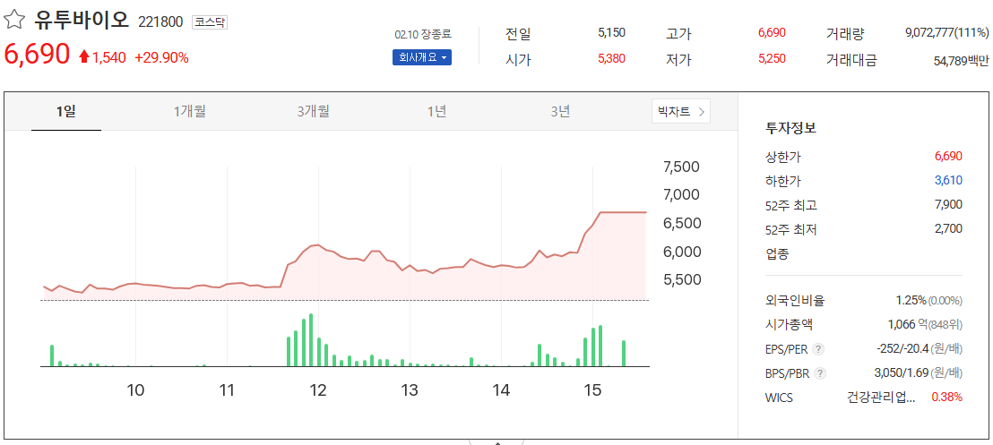 현재가 6,690원 (전일 대비 29.90%↑ 상한가)