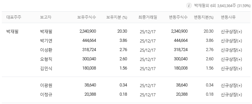 | 박재필 대표이사 | 약 20.30% | 창업자 및 경영권 보유 |