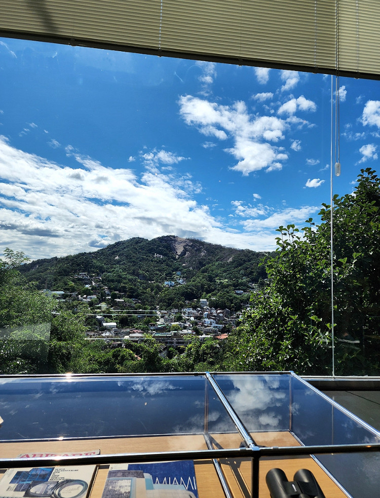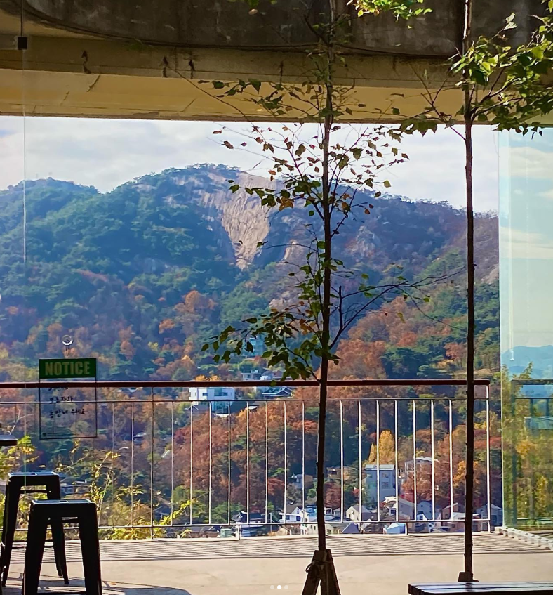 창밖으로 펼쳐진 인왕산 자락은 마치 거대한 자연이 빚어낸 한 폭의 수채화 같았습니다. 창틀이 하나의 거대한 액자가 되어, 바깥의 풍경을 실내로 온전히 끌어들이고 있었습니다. 제가 방문했던 날은 맑은 날씨 덕분에 푸른 하늘과 짙은 녹음이 어우러져 시각적인 힐링을 선사했습니다. 이곳은 계절이 바뀔 때마다 완전히 다른 그림을 보여줄 것이 분명합니다.