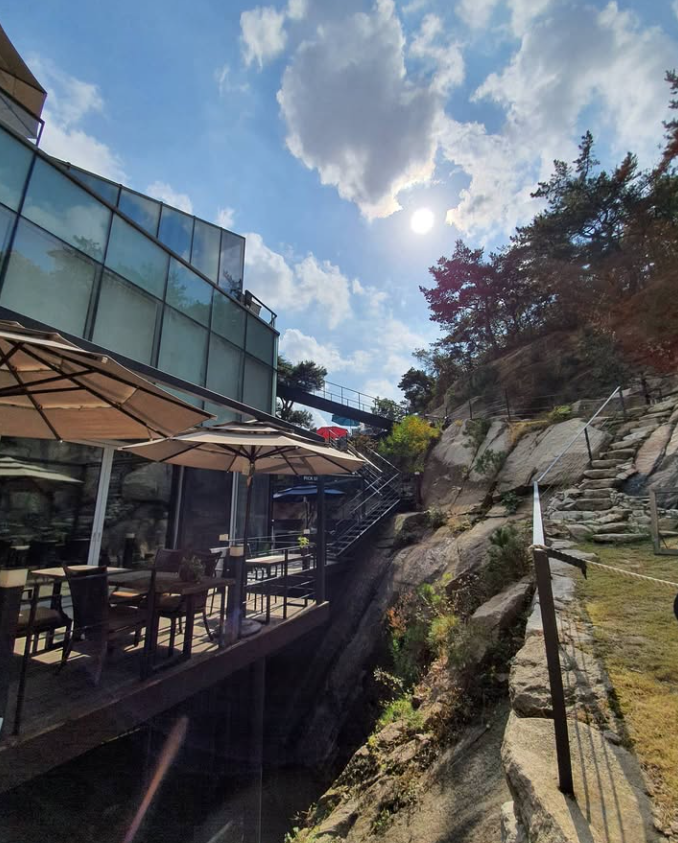 거친 숨을 몰아쉬며 카페 입구에 들어서는 순간, 눈앞에 펼쳐지는 비현실적인 광경에 저도 모르게 탄성을 내뱉고 말았습니다. 서울 하늘 아래 이런 곳이 숨겨져 있었다니 놀라울 따름이었죠. 더 피아노는 단순하게 산을 바라보는 카페가 아니라, 바위와 숲, 그리고 계곡이라는 대자연의 품속에 건물이 스며들어 있는 듯한 독특한 구조를 자랑합니다.