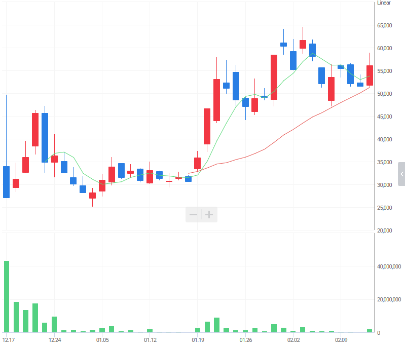 현재 주가는 상장 초기 과열 구간을 지나 안정적인 우상향 채널을 형성하고 있습니다. 공모가인 16,500원 대비 약 230% 이상 상승한 수치로, 시장은 이 회사의 성장 가치를 높게 평가하고 있습니다.