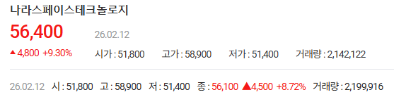 - 현재 주가: 56,200원 (전일 대비 +8.91%)