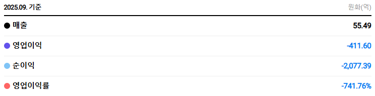 • 영업이익: 여전히 적자 상태입니다. R&D(연구개발) 비용과 마케팅 비용이 상당 부분을 차지하고 있으나, 적자 폭은 점진적으로 개선되는 추세입니다.