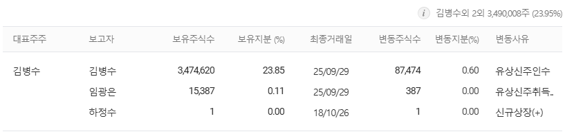김병수 대표이사 23.85% 3,474,620주 보유