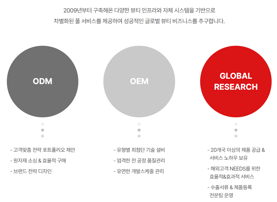 1. ODM/OEM 사업: 글로벌 브랜드의 화장품을 위탁 생산.