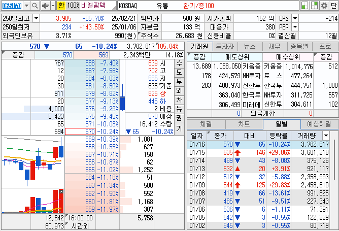 - 신규 투자자라면: 단순히 주가가 싸다는 이유로 접근하기보다는, 재무 구조 개선 여부와 시가총액이 안정권(150억 이상 유지)에 들어오는지 확인 후 분할 매수로 접근하는 것이 안전합니다.