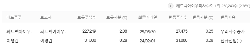 | 주요 주주 | 지분율 (2025년 9월 분기보고서 등) |