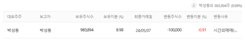 | 박성동 | 8.98% | 983,894주 보유 |