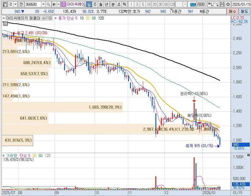 아이씨에이치의 주가가 2025년 12월 23일 상한가 이후, 끊임 없이 하락하고 있습니다.