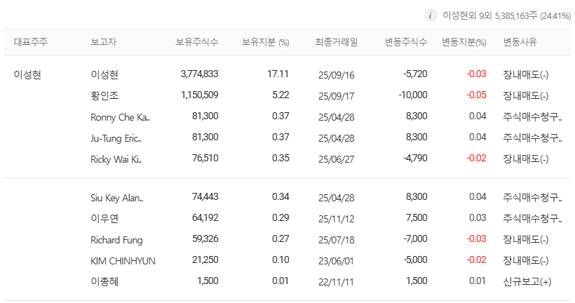 이성현 대표이사 및 특수관계인 약 24.41% 경영권 안정 및 기술 중심 경영