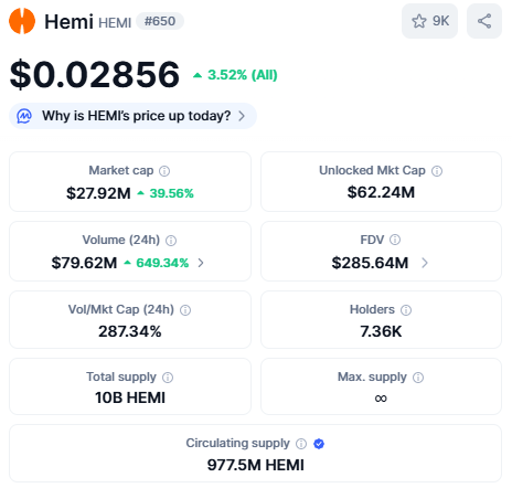 분석: 일부 시장 분석가들은 HEMI의 낮은 완전 희석 가치(FDV)를 잠재적 성장 동력으로 낙관하고 있으나, 높은 FDV(완전 희석 가치)는 장기적인 지속 가능성에 대한 의문을 제기하기도 합니다.