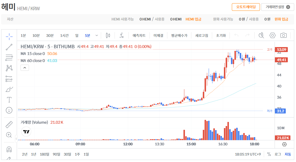 빗썸 (Bithumb) 원화 마켓 (HEMI/KRW) 높은 거래량 추정 2025년 9월 원화 마켓 상장