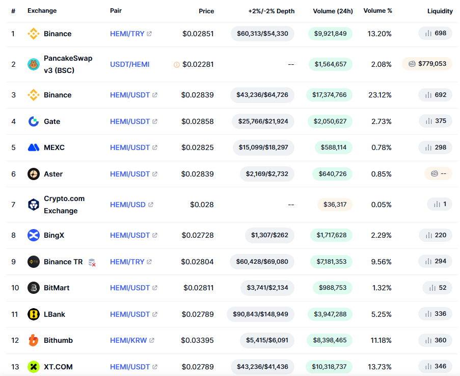 MEXC 현물 (HEMI/USDT) 약 9.66M 달러 (2025년 11월 24일 데이터 기반)